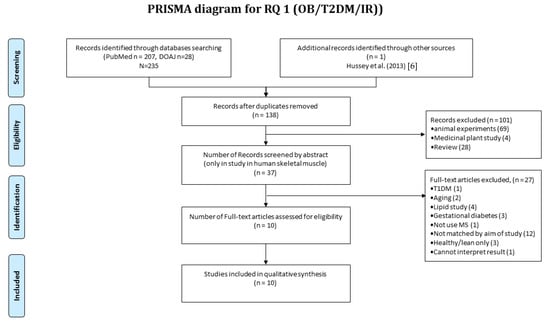 Four stages of literature appraisal including identification, screening, eligibility, and inclusion were used. PubMed and the Directory of Open Access Journals (DOAJ) databases were searched using the following terms for RQ1: proteom* AND skeletal muscle AND obesity OR insulin resistance OR impaired glucose tolerance OR diabetes (RQ1); and for RQ2: proteom* AND skeletal muscle AND exercise. Searches were limited to the period between 1996 and 2016, and the last literature search was performed on 14 November 2016.
