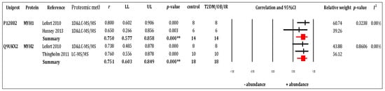 Forest plots of meta-analysis outcomes of muscle proteomics data relating to human obesity and T2DM. Two out of 13 proteins were significantly different (MYH1 and MYH2). Effect size (ES) of each protein was combined by two studies (k = 2) and was presented based on weighted Pearson product moment correlation (r) with 95% Confidence interval (95% CI). Both proteins were illustrated large effect size and were analysed by fixed-model ( = 0.750 (0.577, 0.858), = 0.000, = 0.00%, p = 0.324; and = 0.751(0.603, 0.849), = 0.000, = 0.00%, p = 0.861).