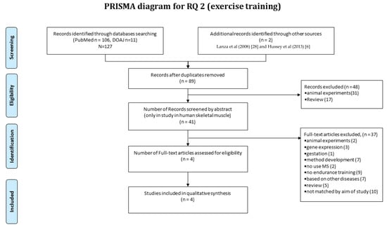 The systematic review of muscle proteomics data relating to human muscle responses to exercise (i.e., RQ2) was separate to the review of literature relevant to RQ1. In total, 127 publications were collected in the initial searches, and two [6,28] were manually integrated for screening. Forty-one papers were included after elimination of duplicates, and when each abstract was screened against the eligibility criteria, a further 48 publications were excluded. The majority (n = 31) of the excluded studies were conducted without identifying the protein response to exercise or were performed in non-human animal models, and 17 were review articles (Figure 3). Therefore, four full-text articles passed the quality threshold and were retained for further assessment. The earliest studies meeting these criteria were Lanza et al. [28] reporting a cross-sectional comparison of habitually trained versus untrained individuals, and Holloway et al. [16] reporting longitudinal analysis in response to a six-week regimen of high-intensity interval training.