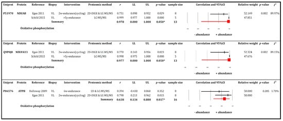 Forest plots of meta-analysis outcomes of muscle proteomics data relating to human muscle responses to endurance exercise. The summary effect of 3 individual proteins and abundance change were analysed by Mixed-model method and depicted in pink rectangular box. All proteins function mainly in the oxidative phosphorylation pathway. The effect size (ES) of each protein was combined for two studies (k = 2) (Holloway 2009, Egan 2011, or Schild 2015) and was presented based on weighted Pearson product moment correlation (r) with 95% Confidence interval (95% CI). All proteins large effect size and presented from trivial to very large range when refer to population (95% CI) i.e., = 0.978 (0.000, 1.000), = 0.050, = 89.97%, = 0.977 (0.000, 1.000), = 0.050, = 89.15%, and = 0.638(0.134, 0.880), = 0.017, = 1.70%.