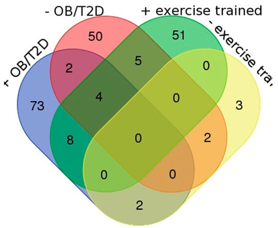 Venn diagram of non-redundant proteins extracted by systematic review of literature relating to RQ1 and RQ2. Proteins reported under RQ1 to be greater in abundance in the muscle of obese/T2DM muscle (+OB/TSDM, n = 73) or less abundant in the muscle of obese/T2DM muscle (−OB/T2DM, n = 50) are overlaid with proteins reported under RQ2 that were either more abundant in exercise-trained muscle (+EXERC, n = 51) or less abundant in exercise trained muscle (−EXERC, n = 3).