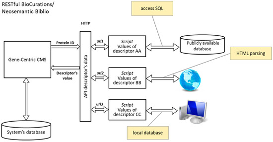 Data management within the Gene-Centric Content Management System. Descriptors are used to bind the local flow of the proteomics data to the algorithmically-derived data and the data loaded from the public resources on molecular biology. url—universal resource locator, supporting the RESTful protocol.