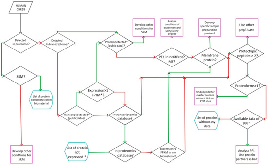 The input of the GenoCMS included the initial knowledge of human chromosome 18; information was fetched from UniProt as a list of gene identifiers (see Figure 2). For each gene, whether or not the proteins were detected in our proprietary set of experiments was deciphered [17,18,19,20]. Within the set it was necessary to sort out which genes were detected at the protein level by SRM-MS and which of them were expressed at the transcriptome level (detected by NGS—next generation sequencing).
