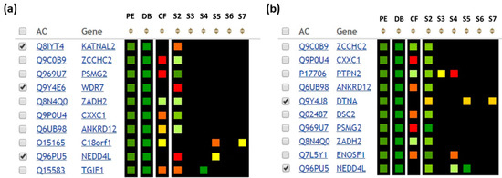 Using the GenoCMS we have analyzed the missing proteins of Chr18 [25]. In browsing the kaleidoscope of heat-matrices of different datasets it was noticed that sometimes missing proteins become visible (see Figure 4). These appearances were due to the transcriptome profiling of the cell line HepG2 and the liver tissue. It was found that there were no expressions of the canonical form but expression of splice forms S2–S7, as shown at Figure 4, for three and two genes respectively, (Figure 4a) and HepG2 (Figure 4b), was observed in the liver tissue. Visually this is shown in Figure 4 as a black background color in column CF (canonical form), and colored squares for the S2–S7 descriptors (the color depends on the level of expression of the splice variant).