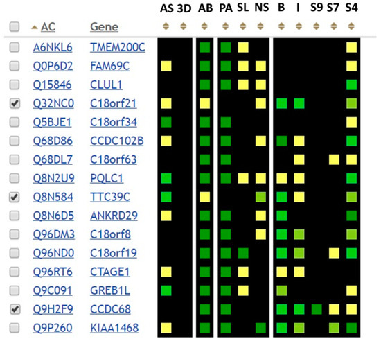 Following the rule of guilt-by-association one more target could be proposed; the ССВС68 protein. Contrary to the previous two targets (C18orf21 and TTC39C), we observe strong evidence that CCBC68 was detected in many tissues by MS and AB. The “guilt” of CCBC68 was that it demonstrated the highest degree of occurrence in the interactome databases (see columns B, I, and S9–S7 in Figure 5). It was the only protein which achieved a green color in the StringDB with an extremely high score of >0.9.