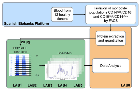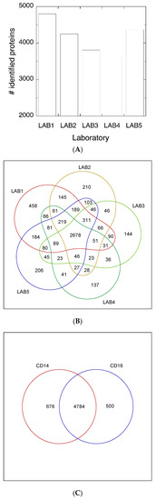 The study of monocyte subsets is a very active research field because of their implication in many diseases. The molecular description of these cells should provide important information on their biology and function. There has been some genome-wide transcriptomics analysis [6,13,14] of individual monocyte subsets, but less information at the protein level is available. Most proteomic analyses performed on monocytes have used monocyte derived cell lines or with the whole monocyte population [33,34,35,36,37,38,39,40,41,42]. Wong’s group have carried out proteomic analysis on purified monocyte populations [43,44], where they used iTRAQ to determine differences between cell populations. They used purified classical monocytes, but they did not purify intermediate from non-classical subsets. This mixed population is termed CD16+. In this scenario, and under the umbrella of the HPP, we aimed to establish a robust procedure that could be used in any proteomics laboratory to analyze monocyte subsets. Thus, a multicentric proteomic analysis of classical (CD14high/CD16−) and non-classical (CD14−/low/CD16high) monocyte subsets derived from 12 healthy volunteer donors was performed in five different laboratories. Our workflow consisted of a protein fractionation by SDS/PAGE followed by the LC-MS/MS shotgun analysis of 10 gel slices (Figure 1). The procedure provides a good compromise between proteome coverage and throughput that could be considered to be a useful proteomic tool for studying and comparing the proteome profile of monocyte subsets under different physiological and pathological conditions. Inter-laboratory experiments are very useful, because they allow the evaluation of the robustness of proteomic workflows. In this context, our results indicate that, despite the number of individuals and laboratories participating in the study, the procedure is quite reproducible. The number of identified proteins ranged from about 3600 to 4800 proteins in the five participating laboratories (Figure 2A), with more than 2600 of them found in all laboratories (Figure 2B). Virtually the same number of proteins were identified in each cell type with more that 85% overlap (Figure 2C). The identified proteins are evenly distributed among chromosomes with an average chromosome coverage of about 30% (Figure 2D), and without any significant difference in chromosome coverage between cell types. Only Y chromosome and mitochondrial DNA, which have a small number of proteins, showed extreme coverage values. According to neXtprot database, 111 of the identified proteins should be classified as missing proteins, since they are within the protein evidence categories 2 and 3 (Figure 2D). However, further investigation will be necessary to confirm these missing proteins.