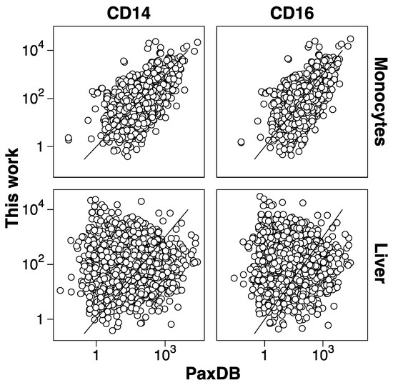 Protein abundance correlation between purified monocyte populations and public datasets obtained from PaxDB. Protein abundances determined in the present work (y-axis) are plotted against public datasets (x-axis). CD14 (classical) and CD16 (non-classical), are shown in left and right panels, respectively. Complete monocyte population and liver datasets are shown in the top panels and bottom panels, respectively.