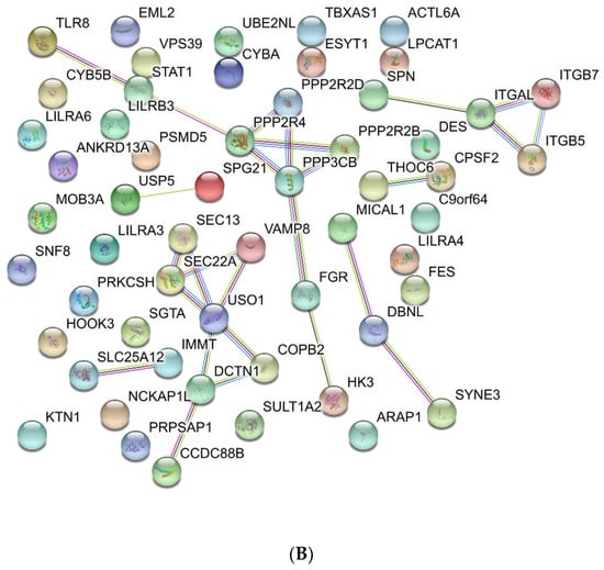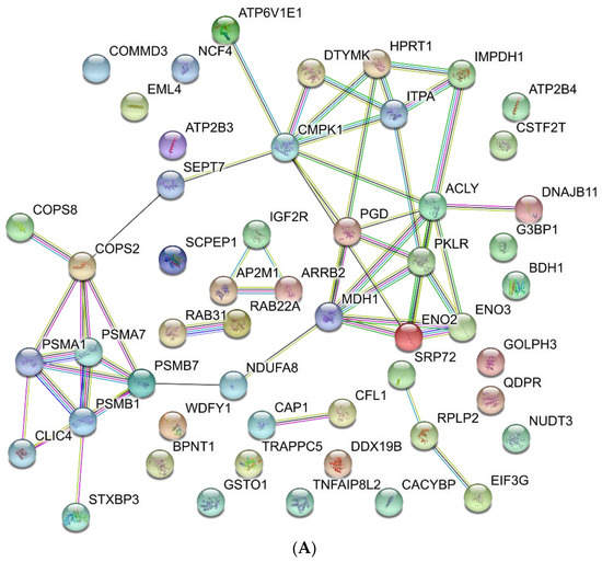 STRING analysis. (A) Increased abundance proteins in classical monocytes; (B) Increased abundance proteins in non-classical monocytes. STRING color code for interacting lines: cyan: curated databases; magenta: experimentally determined; green: gene neighborhood; red: gene fusions; blue: gene co-occurrence; golden: textmining; black: co-expression; purple: protein homology.