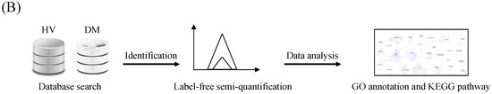 To achieve a comprehensive analysis of the urinary proteins by LC-MS/MS, a duplicate analysis of the same sample was performed for urine samples from 5 healthy volunteers and 5 non-microalbuminuric DM patients (Figure 1). The amount of each protein was semi-quantitated by the emPAI value and compared statistically between the two groups. The proteins up- or down-regulated in the DM patient urine were analyzed by the GO annotation and KEGG pathway tools to elucidate the characteristics of the proteins and pathways.
