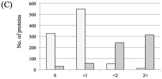 The average numbers of proteins identified in the HV and DM patient urine were 979 and 694, respectively (Figure 2A). From the Venn diagram, 494 unique proteins of healthy subjects, 146 unique proteins for DM subjects and 963 shared proteins were demonstrated. Furthermore, proteins identified in more than three out of five samples were regarded as proteins with more strict identification (Figure 2B). From the result, the total number of identifications did not change greatly and unique and shared protein numbers were significantly decreased. To estimate the quantity of each protein, we employed the emPAI value for comparison and extracted highly changed proteins from strict protein identification. In this study, results that were more than 2 times greater were used for comparison between healthy and DM subjects. The number of proteins that increased in DM cases was only 13. On the other hand, 314 proteins were decreased. Interestingly, the rate of decrease was greatly shifted (Figure 2C).