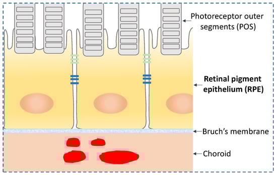 The retinal pigment epithelium (RPE) are polarized cells in the retina that form a monolayer at the interface between the photoreceptors and the extracellular matrix structure termed the Bruch’s membrane (BM) (Figure 1). At its apical side, the polarized RPE interact with the outer segments of the photoreceptors; at the basolateral side, the RPE receive and process input from systemic circulation via the choroid capillary system. The RPE are a critical constituent of the blood-retinal barrier, which enables selective transport of molecules in and out of the retina and preserves the immune privilege of the retina. The RPE are the cells with the highest phagocytosis activity in the human body. Through this activity, the RPE remove and recycle photoreceptor outer segment (POS) membranes and are therefore essential to maintain POS health. A thorough description of the RPE biology is outside the scope of this review; therefore, for a more in-depth knowledge on this subject, the reader is encouraged to consult the extensive body of literature available [,].