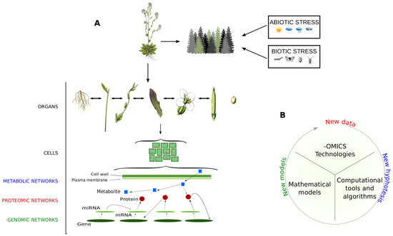 Holistic view of plant organisms. (A) Like each living organism, it is assumed that plants are made up of networks integrated and communicating on a multiple scale. They include molecular networks, where genes, transcripts, proteins and metabolites interact to carry out biological functions and processes, and social networks, where plants interact with other organisms/factors and are subjected to abiotic and biotic stresses; (B) Steps and main components to perform data-derived systems biology approaches.