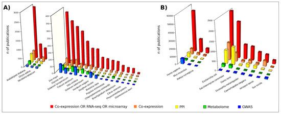 Publications retrieved by interrogating the free search engine PubMED (Data updated in February 2018). Red bars: publications found following the search “Co-expression OR RNA-seq OR microarray [Title/Abstract] AND Organism name”; Orange bars: “Co-expression [Title/Abstract] AND Organism name”; Yellow bars: “Protein-protein interaction [Title/Abstract] AND Organism name”; Green bars: “Metabolome [Title/Abstract] AND Organism name”; Blue bars: “Genome-wide association study [Title/Abstract] AND Organism name”; (A) Publications concerning a set of plant organisms; (B) Publications concerning a set of model organisms.