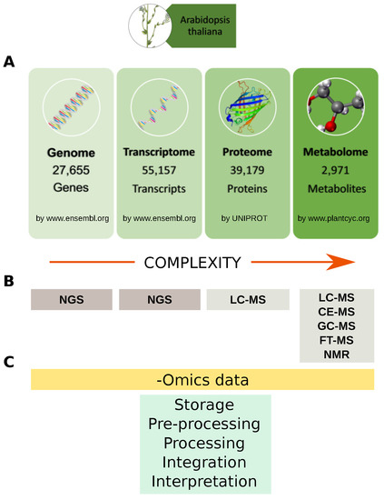 Omics data and analytical technologies. (A) Example of Arabidopsis thaliana genes, transcripts, proteins and metabolites available in specialized databases; (B) Main analytical technologies for profiling genes, transcripts, proteins and metabolites. Data complexity increase from genome toward metabolome. To date about 39,179 (more than 23,000 are unreviewed) Arabidopsis thaliana proteins are stored in the UNIPROT database, while it is estimated that plant kingdom metabolome counts more than 200,000 metabolites with a vast range of functional and structural diversity; (C) Main steps for handling-omics data from storage to biological interpretation. NGS: Next Generation Sequencing; LC: Liquid Chromatography; CE: Capillary Electrophoresis; GC: Gas Chromatograpgy; FT: Fourier Transform; MS: Mass Spectrometry.