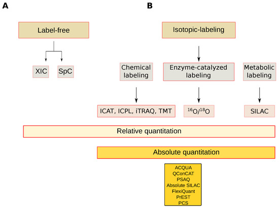 Mass spectrometry-based quantitative approaches. (A) Label-free approaches; (B) Isotopic labeling approaches. XIC: Extracted-ion chromatogram, SpC: Spectral count, ICAT: Isotope-coded affinity tag, ICP: Isotope-Coded Protein Label, iTRAQ: Isobaric tag for relative and absolute quantitation, TMT: Tandem Mass Tags, 16O/18O: Oxygen isotope ratio, SILAC: Stable isotope labeling by/with amino acids in cell culture, AQUA: Absolute quantification, QConCAT: Quantification concatamer, PSAQ: Protein Standard Absolute Quantification, Flexiquant: Full-length expressed protein quantification standard, PrEST: Protein Epitope Signature Tags, PCS: Peptide-Concatenated Standards.