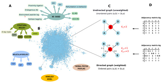 Protein-protein interactions (PPI) identification. (A) Methodologies to identify protein-protein interactions (PPI); (B) Arabidopsis thaliana PPI network retrieved from STRING database by applying a threshold of 0.7. The network contains 8857 nodes and 180,178 edges (Experimentally validated/Database); (C) Example of graph undirected and unweighted and directed and weighted; (D) Adjacency matrices describing a graph undirected and a graph unweighted and directed and weighted. PPI networks are usually unweighted and undirected. K = node degree, Kin = node in-degree, Kout = node out-degree, SEC: Size-exclusion chromatography, IEX: ion exchange chromatography, XL-MS: cross-linking mass spectrometry, HDX-MS: Hydrogen Deuterium Exchange mass spectrometry, X-ray cryst.: X-ray crystallography, NMR: Nuclear magnetic resonance, EPR: Electron paramagnetic resonance, Cryo-EM: Cryo-electron microscopy, SAXS: Small-angle X-ray scattering,Y2H: yeast two-hybrid, BIF: Bimolecular Fluorescence Complementation, FRET: Förster resonance energy transfer.