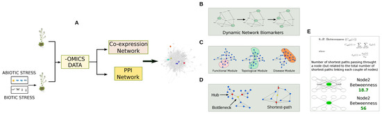 Topological and functional evaluation of co-expression and PPI network models. (A) Protein and transcript levels are used to reconstruct co-expression networks or to be combined to PPI networks; (B) The reconstructed networks are matched with differentially expressed proteins to characterize dynamical network biomarkers that represent genes/proteins showing time-dependent alterations; (C) By using cluster algorithms, topological (nodes highly connected), functional (nodes highly connected and cooperating to carry out a specific function) and disease (nodes highly connected and cooperating in developing a specific disease) modules are identified; (D) The network structure is analysed by specific topological parameters (or centralities) [38], including betweenness, to identify hub or bottleneck genes/proteins, while the Shortest Path measure finds all the shortest paths between two nodes; (E) Betweenness centrality and simulation of its variation.
