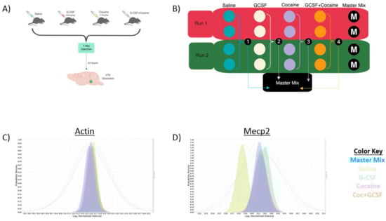 Experimental design and validation. (A) Animals were injected with ± G-CSF (50 μg/kg) ± Cocaine (7.5 mg/kg) a 2 × 2 design. Injections were done once daily for 7 days and animals sacrificed 24 h after the final injection and the VTA dissected out for analysis. (B) To allow for significant power, two runs of the TMT 10-plex were run with two samples from each group per run (total 4/group) with a mix comprised of an equal amount of each sample run as a Master Mix run to allow normalization between runs. Median intensity values of actin, which was not significantly changed in any group show near complete overlap (C) whereas Mecp2 shows increase in all non-saline groups with the expected change in median intensity (D).