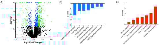 To provide a context for how these large-scale protein changes induced by G-CSF might be affecting neuronal function in the VTA we analyzed the subset of proteins found to be significantly regulated to look for changes in intracellular signaling networks. Analysis of canonical signaling pathways identified multiple that were significantly up or down-regulated (Table 1 and Figure 2B,C). Among the seven most significantly down-regulated pathways (Figure 2B), there were multiple that relate to signaling downstream of cyclic-adenosine monophosphate (cAMP)—a second-messenger signaling system heavily implicated in response to drugs of abuse []. We see down-regulation specifically of the cAMP-mediated signaling pathway, the protein kinase A (PKA) signaling pathway which is downstream of activated cAMP, and the CREB1 signaling pathway. When looking at pathways that were significantly upregulated (Figure 2C) we see increases in pathways related to transcriptional and translational control. This includes marked increases in the eukaryotic initiation factor 2 (EIF2) pathway which is critical for the initiation of translation from mRNA to protein []. Furthermore, sirtuin and granulocyte-macrophage colony stimulating factor (GM-CSF) are also increased. Sirtuins are a class of histone deacetylase enzymes and changes in their function have previously been shown to be important for behavioral response to cocaine and opiates [,]. GM-CSF is another colony stimulating factor molecule that shares some signaling pathways with G-CSF, and this increase in this signaling pathway may be due to the overlap in the signaling between the two sets of proteins.