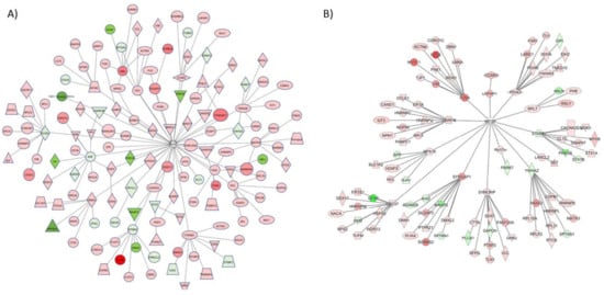Key upstream regulators of proteins altered by G-CSF. From the proteins identified as significantly altered by repeated G-CSF treatment, we used IPA analysis to identify key upstream regulators. Two of the most robust were FMRP (A) and mTOR (B). These dendrograms represent all proteins that were significantly changed in this dataset that are predicted to be directly downstream of these regulators, and those that are predicted to be directly downstream of those (two degrees of regulation). Proteins visualized in red are significantly increased, and those in green were significantly decreased.
