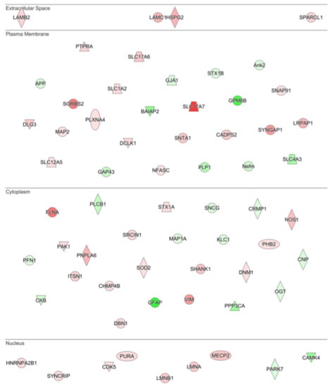 Examination of the most significantly regulated disease and function changes predicted by IPA in the G-CSF treated samples revealed networks related to changes in neuronal morphology, with the most significantly regulated network being “Morphology of Neurons” (p = 1.22 × 10−13). The significantly regulated proteins belonging to this network are illustrated according to their predicted subcellular distribution in Figure 4—which demonstrates that G-CSF had significant effects on nuclear, cytosolic and cell membrane proteins known to affect the morphological structure of neurons. In sum this network of significantly regulated proteins was comprised of 64 proteins 23 down-regulated and 41 up-regulated (p values and fold change values in Table S4).