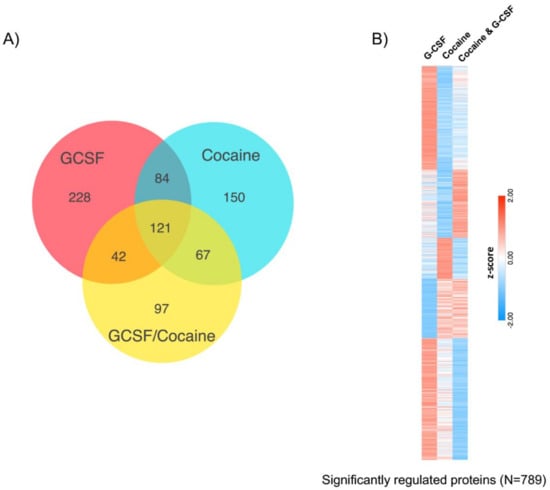 When examining the number of proteins that were significantly altered between the different treatment groups, it was found that treatment with G-CSF alone leads to changes in the largest number of proteins (Figure 5 and Figure 6). This may be due to the fact that activation of the G-CSF receptor has been coupled to direct activation of transcription factors [,,]. In contrast, cocaine directly leads to changes in multiple neurotransmitter systems, but its effects on gene expression are tightly coupled with context and behavior [,,]. It is interesting that the combination of G-CSF and cocaine lead to the smallest number of regulated proteins of the three treatment groups (Figure 5B). This suggests the possibility that there are interactions between signaling pathways after G-CSF and cocaine in the two that temper changes in protein expression in the VTA.