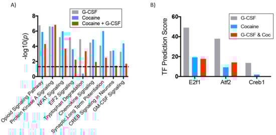 Given the substantial number of proteins altered in all treatment groups, analyses were performed to determine which transcription factors were predicted to be affecting the largest number of proteins in the samples. To do this, all of the proteins that were up-regulated relative to saline in each group were uploaded to the Enrichr software package (freely available: http://amp.pharm.mssm.edu/Enrichr/). Using inputs from an exhaustive list of published studies, this software predicts the transcription factors most likely to be upstream of regulated proteins and provides a transcription factor prediction score []. Based on this, the transcription factors likely to be responsible for the most changes in each group were identified. For these analyses focus was placed on two transcription factors that achieved statistically significant prediction value for each of the three treatment groups, as well as CREB1 which was significantly regulated only in the G-CSF group, but which has been broadly implicated in the neurobiology of addiction [,]. These analyses predicted the E2F1 transcription factor to be the strongest regulator of proteins in the G-CSF group, but is also a significant driver of transcription in the other two experimental groups (Figure 7B and Table S9). A similar pattern is seen for both Atf2 and CREB1. While not yet conclusive, these analyses identify potential hub molecules that are driven by G-CSF signaling to induce neuronal and potentially behavioral plasticity.