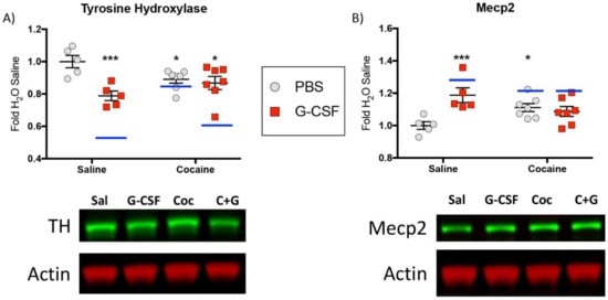 Analysis of tyrosine hydroxylase levels demonstrated changes similar in magnitude to those that were reported with the initial analyses. Two-way ANOVA demonstrated a main effect of G-CSF (F(1,20) = 11.63; p = 0.003) and a significant G-CSF x cocaine interaction (F(1,20) = 7.612; p = 0.012) but no main effect of cocaine (F(1,20) = 0.202; p = 0.66). Post-hoc analyses (Fisher’s LSD) demonstrated significant differences with all treatment groups compared to the Saline controls (Figure 8A—asterisks). To compare the results from the Western blots to the mass spec data from above, the fold-change from saline for all groups is marked on the graphs with a blue line. While the magnitude of the changes were not identical, they were quite similar and all in the same direction. A similar pattern for Mecp2 was also seen. We found a main effect of G-CSF (F(1,20) = 6.707; p = 0.018) and a significant Cocaine x G-CSF interaction (F(1,20) = 11.19; p = 0.003), but no main effect of cocaine (F(1,20) = 0.02; p = 0.88). Post-hoc testing demonstrated significant differences between Saline and G-CSF and Saline and Cocaine (Figure 8B)