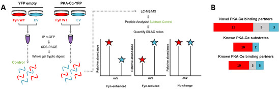 SILAC experimental design for the characterization of the effect of Fyn activity on PKA–Cα binding partners. (A) SILAC experimental workflow. Conditions of control (YFP alone) and experimental (PKA–Cα-YFP) SILAC pairs are indicated. Light SILAC culture conditions (with Fyn WT) are shown in red, while heavy conditions (with Fyn KD) are represented in blue. The workflow is described in detail in the legend to Figure 1. Expected outcomes are as follows: PKA-C interactors either exhibit enhanced binding in the presence of Fyn activity (H:L ratio < 1), reduced binding in the presence of Fyn activity (H:L ratio > 1), or exhibit no statistically significant difference between the two conditions (H:L ratio = 1); (B) experimentally identified PKA-C interactors and the effect of Fyn on known and novel PKA–Cα binding partners and known PKA–Cα substrates. Red indicates Fyn activity-enhanced binding, blue indicates Fyn activity-reduced binding, and gray indicates no significant change in binding.