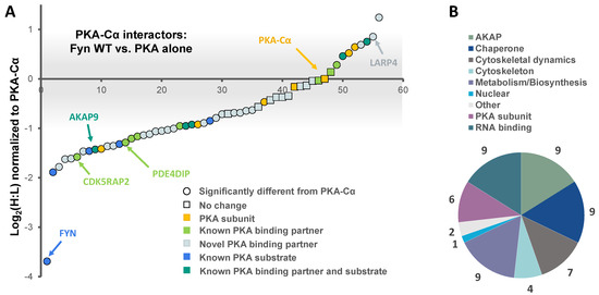 The effect of the tyrosine kinase Fyn on proteins in complex with PKA–Cα. (A) SILAC (H:L) ratios of proteins in complex with PKA–Cα were normalized to the H:L of PKA–Cα. H:L ratios were log2-transformed, and plotted in rank order. Data points denote single proteins, and data point shape indicates whether the H:L ratio of a given protein exhibited a statistically significant difference from (circular) or was the same as (square) that of PKA–Cα. Known and novel PKA interactors and known PKA substrates are highlighted by the colors indicated in the key. The gray bar indicates the range of Log2 values that correspond to less than a 2-fold change (increase or decrease) from the H:L ratio of PKA–Cα; (B) representation of the various cellular functions for the PKA–Cα interactors identified.