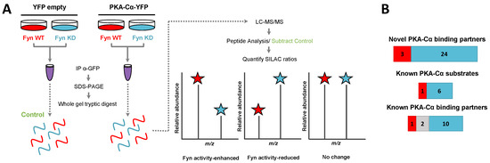 Recently, we have demonstrated a novel reciprocal interaction, in which Fyn and Src directly phosphorylate Y69 of the human α isoform of the catalytic PKA subunit (PKA–Cα), which results in increased PKA catalytic activity in vitro and in cells [21]. These findings led us to hypothesize that SFKs could modulate proteins in complex with PKA–Cα. Here, we employed a quantitative mass spectrometry approach to identify PKA–Cα binding partners whose binding was influenced by Fyn expression and catalytic activity.