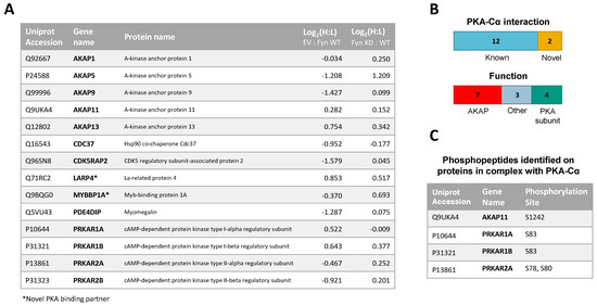 In summary, this study presents Fyn as a novel regulator of PKA–Cα protein–protein interactions. While certain Fyn-enhanced PKA–Cα interactors increased in binding in the presence of active Fyn, the majority of the interactors identified in the quantitative mass spectrometry analyses were Fyn activity-independent. The Fyn-modulated binding of PKA–Cα to three known AKAPs (PDE4DIP, AKAP9, and CDK5RAP2) was characterized biochemically, and the PKA–Cα/AKAP interaction was found to be altered by Fyn catalytic activity and expression levels. In addition, a novel binding partner, LARP4, was shown to bind PKA–Cα in the absence of Fyn when co-expressed in HEK cells. These results contribute to the characterization of a newly identified reciprocal regulatory interaction between the Src family kinase Fyn and PKA.