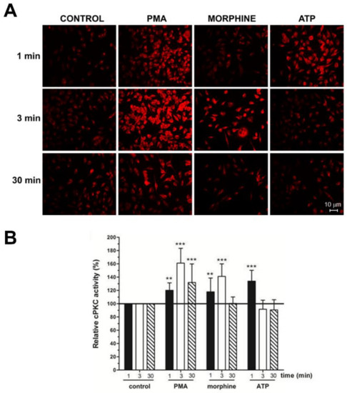 Morphine and Phorbol ester triggered cPKC activation with anti-C2Cat. (A) Neuro-2A cells were treated with 1 μM Morphine, ATP, or 100 nM PMA, for the indicated periods. Activators were removed by washing with PBS and the cells were fixed for immunofluorescence analysis. cPKC activation was performed using anti-C2Cat [40] as the primary antibody, and as a secondary antibody, when conjugated with Alexa 568. (B) The level of fluorescence intensity was quantified using ImageJ® software and the amount of cPKC activity, in each treatment, was normalized to the control levels (fluorescence detected in unstimulated cells), which was set to 100. Results represent the average ± SD of measurements from twelve to fifteen different images, for each condition, statistical significance was determined by ANOVA–Dunnett’s test where *** represents p < 0.001 and ** represents p < 0.01.