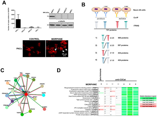 The following are available online at http://www.mdpi.com/2227-7382/6/4/39/s1, Figure S1: PKCα was immunoprecipitated with anti-C2Cat antibody following morphine treatment. Western blot probing for PKCα in two of the three samples processed for protein quantification and identification experiments by Mass Spectrometry, in the presence and absence of 1 μM Morphine for three minutes. No reactivity with anti PKCα was found in samples immunoprecipitated with Pre-immune serum (data not shown).