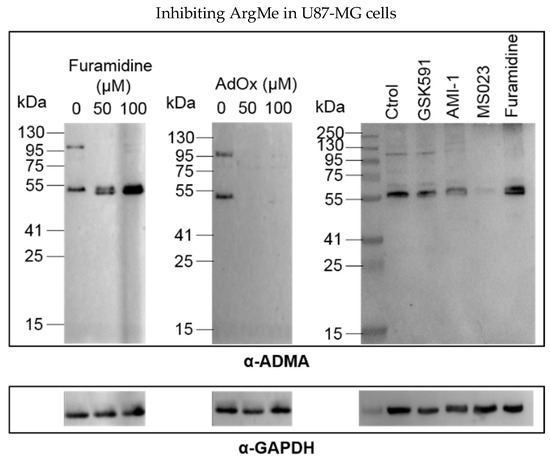 Detection and inhibition of ADMA in U87-MG cells. Left and central panels, dose-response of ADMA inhibition by furamidine and AdOx, respectively. Right panel, ADMA profiles after incubation of U87-MG cells with 100 µM of the indicated inhibitor for 48 h. ADMA was detected using an α-ADMA antibody (#13522 Cell Signaling Technologies, Danvers, MA, USA). For each panel, GAPDH is shown below as a total protein loading control.