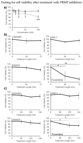 Cells were seeded onto 96-well plates at an appropriate density and treated with either a serial dilution (0–100 µM) or 100 µM PRMT inhibitors. Cell viability was determined by MTS assay according to instructions of the manufacturer (Abcam, Cambridge, UK). Absorbance was measured using a microplate reader. A minimum of 3 biological replicates are represented by averaged values ± SD. Statistical significance of differences between paired samples were determined using Student’s t-test.