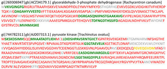 The results of peptide mapping for glyceraldehyde-3-phosphate dehydrogenase and pyruvate kinase. The color of character indicates the peptide confidence; green, yellow, and red means the peptide confidence is ≥95%, <95% ∩ ≥50% and <50%, respectively.