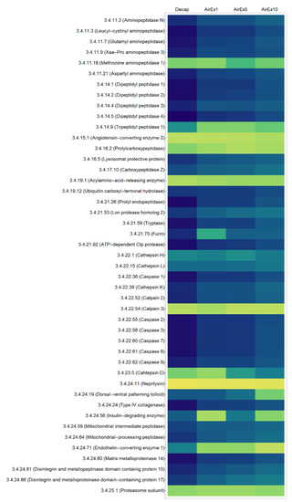 where s is the sample group (Decap, AirEx1, AirEx5 or AirEx10) and is the sum of for all sample groups. However, each value (as shown in Table S4) does not indicate the actual protease activity, but rather is a product of all parameters related to protease hydrolysis such as activity, amount, and specificity. All (parameter corresponding to each protease contribution) will be equal to the in vitro proteolysis with a protease mixture, while some will be markedly higher in the orderly proteolysis of intracellular proteins such as during apoptosis.