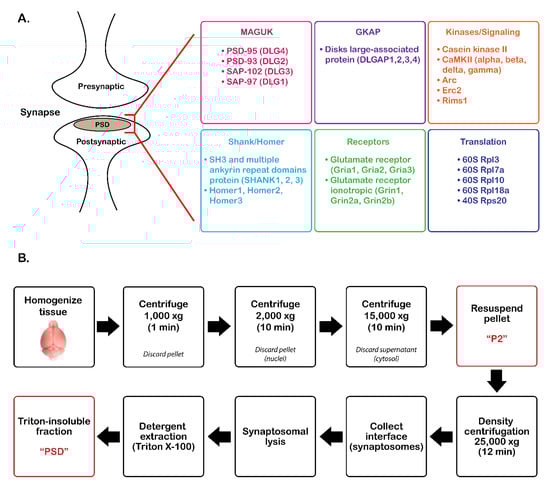 Overview of postsynaptic density (PSD) protein enrichment from mouse cortical tissue. (A) List of groups of commonly identified proteins in the PSD. (B) Steps for PSD enrichment starting from tissue homogenization to Triton X-100 precipitation. MAGUK, membrane-associated guanylate kinases, GKAP, guanylate kinase-associated proteins, DLGAP, disks large-associated proteins.