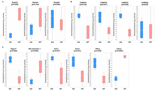Next, individual expression patterns were examined for some of the proteins identified in the analysis. Not surprisingly, Shank3 displayed a five-fold significant decrease in expression in the KO versus WT fractions, while no significant differences in expression were observed for Shank 1 or 2 (Figure 3A). Since the Shank3 protein has 10 expressed isoforms in mice, it can be expected that partial expression of Shank3 will be present even in the absence of the Shank3B isoform. In addition, three out of four of the CaMKII isoforms displayed a significant increase in expression in KO fractions compared to WT fractions (Figure 3B). This result was particularly interesting, as several CaMKII isoforms have previously been shown to interact with Shank3 [41,73]. In addition, several other known Shank3-interacting proteins were found to have significantly different expression in KO compared to WT fractions (Figure 3C) [56,57].