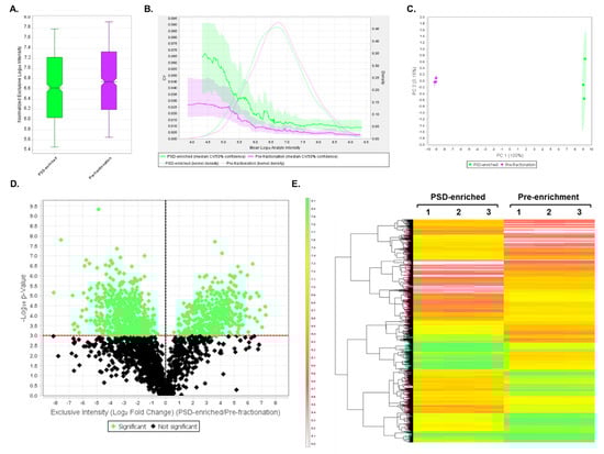 DIA results comparing PSD-enriched and pre-fractionation samples. (A) Box plot displaying quartile, median-normalized log10 intensities for each sample group. (B) Quantitative CVs chart. The bold lines show the relationship between the mean log10 protein intensity and the CV values for PSD-enriched (green) and pre-fractionation (purple) samples. The shaded areas around the plotted lines represent the 50% confidence interval for the CV values. The faint lines indicate the intensity distribution for all proteins within PSD-enriched (green) and pre-fractionation (purple) samples, which were calculated using a Gaussian kernel density estimate. (C) PCA. PCA plot displays the distribution of PSD-enriched (green) and pre-fractionation (purple) samples between PC1 and PC2. The percentages (%) in each axis represent the explained variance for each Principal Component. (D) Volcano plot displaying the log10 p-values for each protein as a function of log2 fold change (PSD-enriched/Pre-fractionation) values after performing a t-test. Proteins that are significantly (p < 0.05, uncorrected values) changing in expression between the two groups are highlighted in green, while proteins whose expression does not significantly differ are shown in black. (E) Heatmap of significantly differentially expressed proteins (p < 0.05) after t-test statistical analysis. In total, 1721 proteins were differentially expressed between PSD-enriched and pre-fractionation replicate samples. A hierarchical clustering tree is displayed on the left of the heatmap. The heatmap scale units are in log10 intensity.
