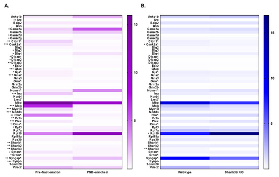 Mean-normalized protein abundance heatmap results from PRM LC–MS/MS analysis. Heatmap of analysis comparing (A) Pre-fractionation vs PSD-enriched samples (purple) and (B) WT vs Shank3B KO samples (blue). Protein accessions are listed to the left of the heatmap, and the degree of statistical significance between the two groups is designated for each protein (* = p < 0.05, ** = p < 0.01, *** = p < 0.005). Protein abundance is plotted as mean-normalized intensity response ratios (light/heavy), which are directly correlated with color intensity within the gradient displayed on the right of the heatmap.