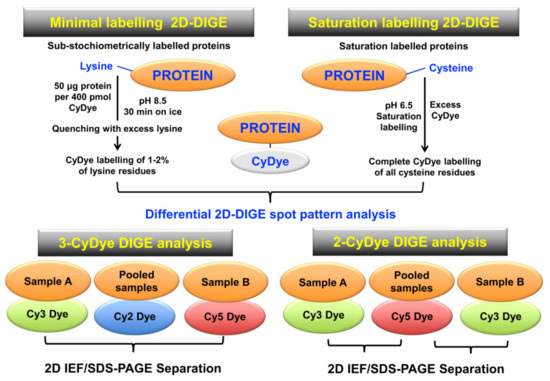 A key 2DGE technique is represented by fluorescence difference in-gel electrophoresis (DIGE) [179,180,181]. Figure 5 compares minimal protein labelling on lysine residues versus saturation protein labelling on cysteine residues prior to gel electrophoretic separation, and also illustrates the different CyDye labeling protocols used in fluorescent two-dye versus three-dye systems [182,183,184].