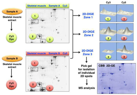 Mass spectrometry (MS) based proteomics is concerned with the systematic analysis of the protein components of a particular biological fluid, cell type, tissue, organ or organism [1], and plays a key role in protein biochemistry and molecular cell biology [2]. Modern proteomics is based on high-performance mass analysers [3,4,5] and is routinely used for cell-specific protein expression profiling, large-scale comparative protein studies, the biochemical characterization of the composition and structure of individual subcellular proteomes, and the determination of the temporal and spatial dynamics within specific protein constituents [6,7,8,9]. Gel-based proteomics is one of the most multipurpose means for the analysis of complex proteomes, such as seen in skeletal muscle tissues [10,11,12]. Two-dimensional gel electrophoresis (2DGE) exemplifies an exceptionally robust strategy to separate, identify, and quantify proteins when used in combination with MS analysis or various immunological tests [13,14,15]. While 2DGE is an effective technique for the systematic analysis of complex protein lysates, the ability to directly visualise changes in the abundance of proteins/post-translational modifications (PTM) is a powerful application.