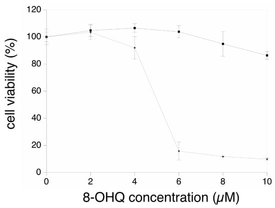 The cells were treated for 24 h with either 8-hydroxyquinoline alone (black curve, square symbols) or with the 8-hydroxyquinoline-copper 2:1 complex (grey curve, diamond symbols). The concentrations on the abscissae are expressed in µM 8-hydroxyquinoline.