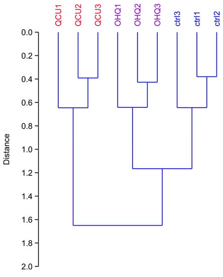 Global analysis of the proteomic experiment by hierarchical clustering. All the spots that showed a p-value <0.25 in either the hydroxyquinoline vs. control or the copper complex vs. control comparisons in the proteomic experiments were used for the calculation of the clustering tree. The PAST software package was used for the calculations, using a Euclidean distance and the Ward’s algorithm. This tree indicates the similarity between the various experimental groups (the higher the distance of the branching point between groups, the more dissimilar they are). Ctrl: unexposed cells. OHQ: cells exposed to 4 µM 8-hydroxyquinoline. QCu: cells exposed to 4 µM 8-hydroxyquinoline +2 µM copper sulfate. 3.2. Detailed Analysis of the Proteomic Results.