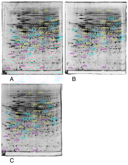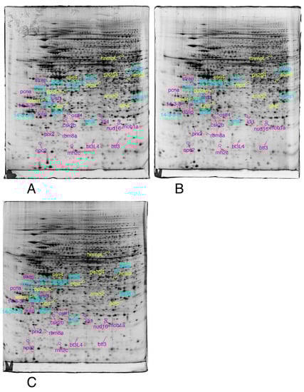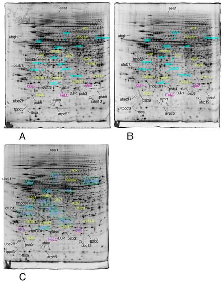 We then selected the spots modulated by at least one of the treatments, on the strict basis of the statistical tests, without any fold change threshold. This allowed to take into account coordinated but low amplitude changes that can be highly significant, as shown before [74]. The proteins were then identified by mass spectrometry. The results are shown on Figure 3, Figure 4 and Figure 5, the raw images, quantitative data and identification data being supplied in Supplementary Figures S1–S3, Supplementary Tables S1 and S2, respectively.