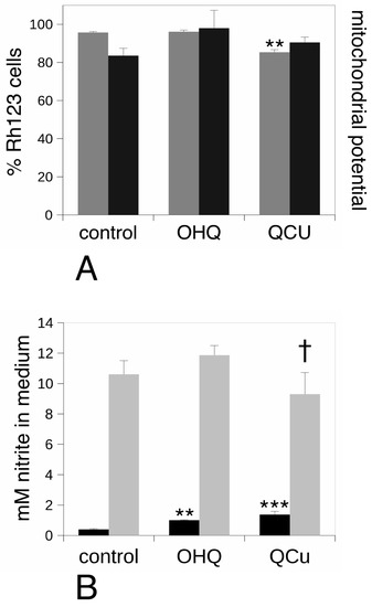 Analysis of the mitochondrial transmembrane potential and of the nitric oxide production. panel (A), the mitochondrial potential was analyzed by the rhodamine 123 accumulation method. Grey bars: proportion of positive cells in the viable cell population. Black bars: mean cellular fluorescence; Ctrl: unexposed cells. OHQ: cells exposed to 4 µM 8-hydroxyquinoline. QCu: cells exposed to 4 µM 8-hydroxyquinoline +2 µM copper sulfate. Symbols indicate the statistical significance (Student T-test): **: p < 0.01. In panel (B), the production of nitric oxide was analyzed. Black bars: production after treatment for 24 h with 4µM 8-hydroxyquinoline ± 2 µM copper sulfate. Grey bars: production after treatment for 24 h with 4 µM 8-hydroxyquinoline ±2 µM copper sulfate and stimulation with lipopolysaccharide for the last 18 h of culture. Ctrl: unexposed cells. OHQ: cells exposed to 4 µM 8-hydroxyquinoline. QCu: cells exposed to 4 µM 8-hydroxyquinoline + 2 µM copper sulfate. Symbols indicate the statistical significance (Student T-test): † p < 0.1; **: p < 0.01; ***: p < 0.001.