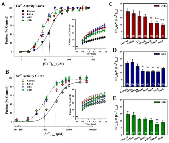 Ca2+ activity curves for homotypic CV–CV fusion (n = 24) yielded a typical sigmodal shape [48] with an EC50 of 16.3 ± 1.3 µM [Ca2+]free (Figure 1A). The thiol reagents used have a biphasic effect, with low concentrations potentiating fusion parameters and high concentrations inhibiting all parameters of Ca2+-triggered membrane fusion [39,40]. Three fluorescent thiol reagents were found to enhance the efficiency of fusion at low concentrations with short incubation times. Treatment of CV with 750 µM LYIA (n = 8), 2 mM mBB (n = 7) and 500 µM dBB (n = 9) for 20 min resulted in leftward shifts in Ca2+ sensitivity to respective EC50’s of 10.8 ± 1.4 µM, 10.9 ± 0.7 µM and 7.8 ± 1.0 µM [Ca2+]free (Figure 1A). An enhancement of late kinetics in response to low [Ca2+]free = 24.3 ± 2.2 µM was also observed with 750 µM LYIA (n = 7), 2 mM mBB (n = 6) and 500 µM dBB (n = 8) treatments (Figure 1A, inset). To further elucidate the involvement of thiol sites in modulating the Ca2+ sensitivity of triggered exocytosis, a weak Ca2+ mimetic was used [30,39]. The resulting Sr2+ activity curves had a similar sigmodal shape to the Ca2+ activity curves; however, Sr2+ is much less efficient at triggering CV–CV fusion, requiring 100-fold higher concentrations. Thus, Sr2+ activity curves from untreated CV (n = 12) had an EC50 of 2600.6 ± 374.8 µM [Sr2+]free (Figure 1B). Treatment of CV with 750 µM LYIA (n = 7), 2 mM mBB (n = 6) and 500 µM dBB (n = 7) for 20 min resulted in leftward shifts in Sr2+ sensitivity to EC50’s of 1222.2 ± 334.3 µM, 1148.7 ± 89.4 µM and 1072.8 ± 159.8 µM [Sr2+]free, respectively (Figure 1B). There was also an enhancement of initial kinetics with 750 µM LYIA treatment (n = 4), and late kinetics with 2 mM mBB (n = 4) and 500 µM dBB (n = 6) treatments, in response to low [Sr2+]free = 3110 µM (Figure 1B, inset). The potentiation of the Ca2+-sensitivity of CV–CV fusion was observed for these fluorescent thiol reagents across treatments in the high micromolar to low millimolar range (Figure 1C,D), while higher treatment concentrations resulted in the inhibition of the Ca2+-sensitivity and extent of fusion (Figure S2).