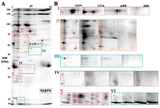 To further narrow the number of candidate proteoforms of interest, the isolation of cholesterol- enriched membrane fragments was used as a prefractionation tool. Cholesterol- and sphingomyelin-enriched domains regulate the efficiency of exocytosis by organizing critical components near the fusion site [8,9,10,11,45,46]. To this end, cholesterol was used as ‘bait’ to enrich proteoforms involved in regulated exocytosis, both to reduce the complexity of the proteome and improve the detection of low abundance labeled proteoforms [40,45]. The cholesterol-enriched CV membrane proteome (Figure 4; Figure S4) contained nineteen spots that corresponded to similar pI-and-MW as labeled spots from total CV membrane (Figure 3). Selective enrichment of certain proteoforms occurred in the cholesterol-enriched membrane proteome (Figure S5). For example, there was an apparent decrease in high molecular weight streaking (Figure 4A; open and closed arrows) whereas there was an apparent increase in the peptides that co-migrate at the gel front (Figure 4A; open arrow head). In Box V, one spot (#32) was reproducibly detected with total protein stain Sypro Ruby in the CV membrane proteome (Figure 2 and Figure 3), while several spots (#32a–e) were reproducibly detected in the cholesterol-enriched CV membrane proteome (Figure 4). In box II, there were two areas that appeared to have altered patterns of labeled spots (#8 and #15) compared to the total CV membrane proteome (Figure 2 and Figure 3). Of these, a total of thirteen spots were observed to be labeled by all three reagents with 100% reproducibility across all trials (n = 3 individual experiments per thiol reagent) (Figure 4B; labeled in bold). These spots were excised and analyzed by MALDI-TOF/TOF and/or LC-MS/MS (Table 1).